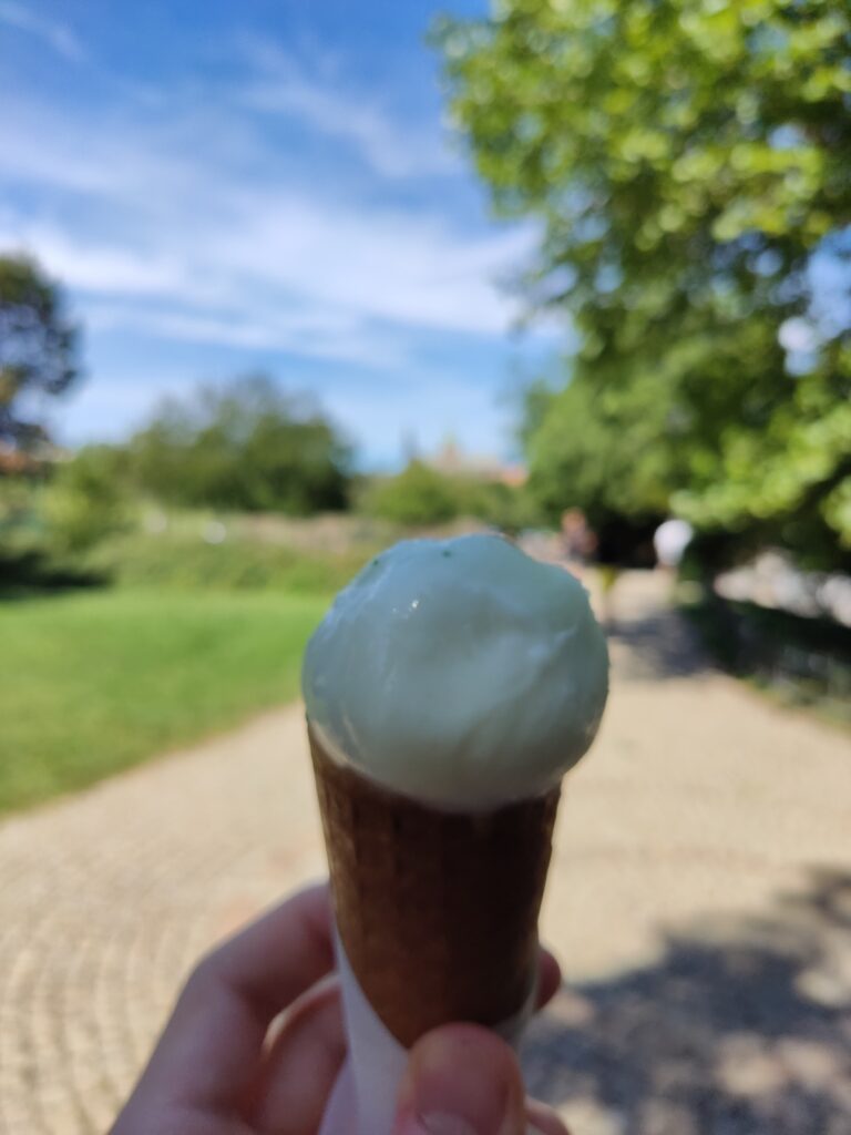 Es ist aber warm genug für ein Eis, die Wahl fällt auf: Melone-Minze, Reis (!), Pflaume, Mango, Kokosnuss, Pistazie, Waldfrucht. Damit setzen wir uns nochmal in den Park von Tag 3. Von da aus ist die Aussicht fast genauso gut wie vom Schloss.