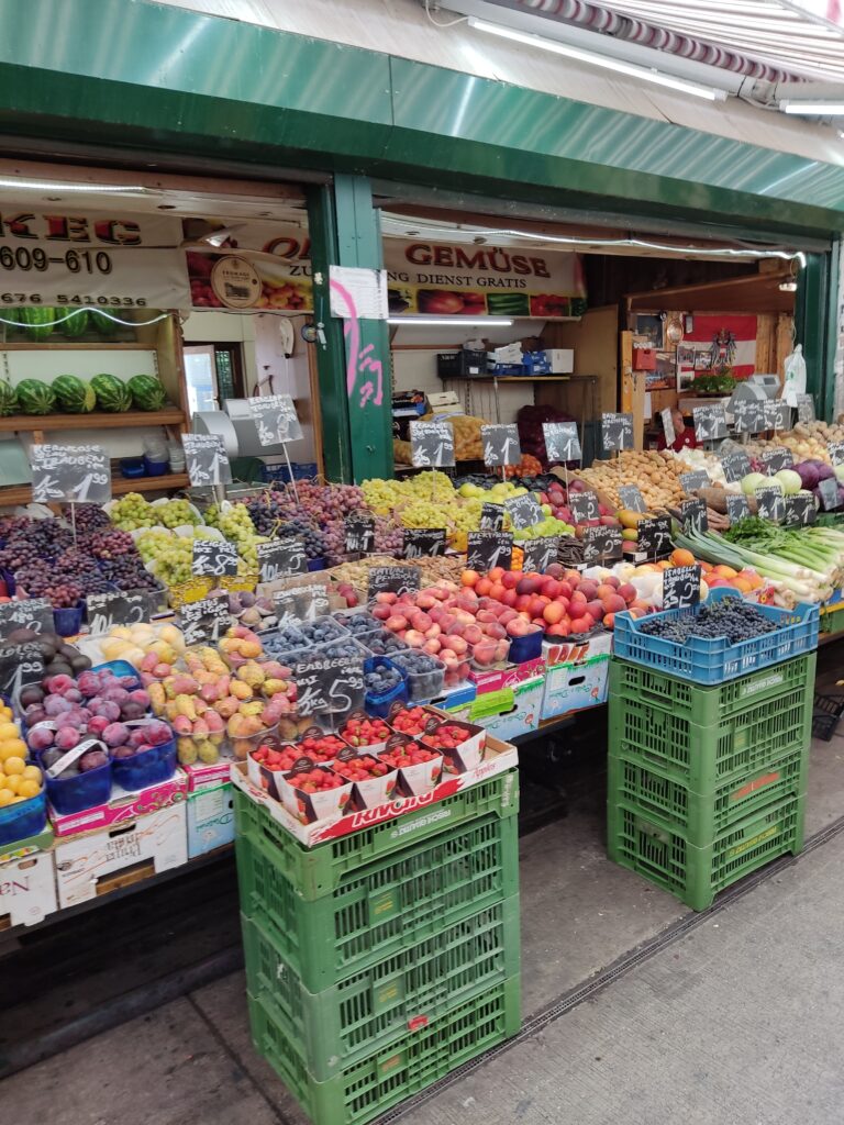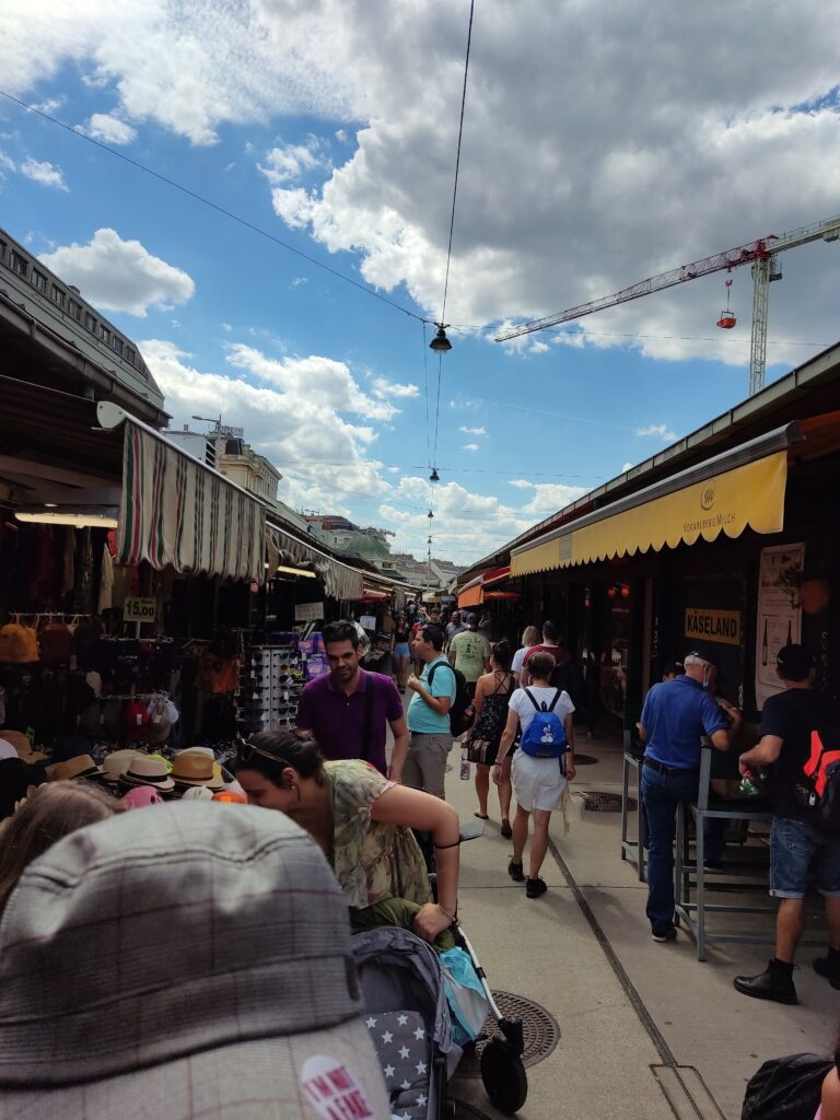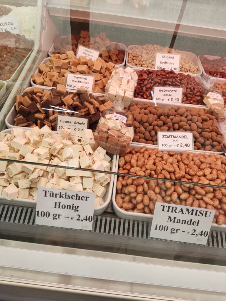 Naschmarkt ist wohl einer der süßesten und besten Namen für einen Markt. Aber oider (Alter), ist der groß! Drei Standreihen über 500 Meter, voller Süßkram, Restaurants, Obst, Gemüse, Käse, Wein, Antipasti, Gewürzen und mehr. Vorher finden wir auch noch ein japanisches To-Go-Restaurant, wo es leckere Miso-Suppe gibt.