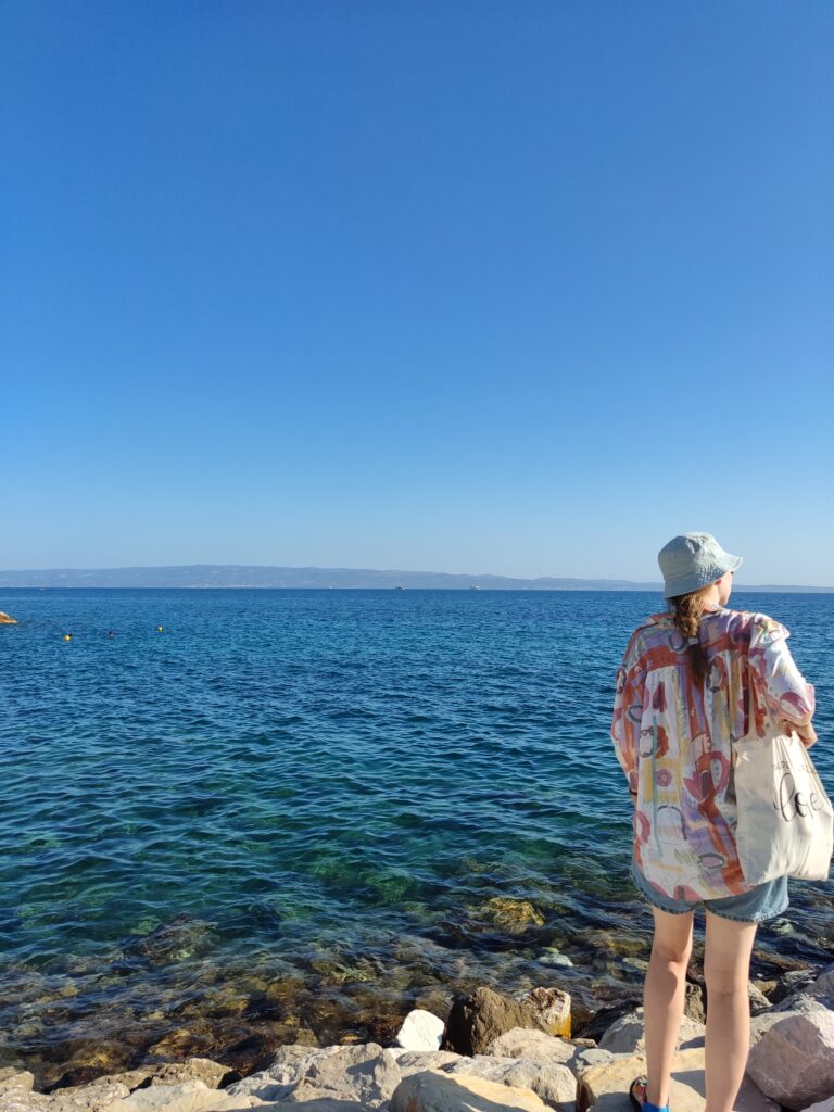 Nach der Ankunft auf der Halbinsel müssen wir erstmal frühstücken. Dann laufen wir in Etappen zum Hostel, mit Pausen in Parks. Im Hostel ruhen wir uns aus, und dann ab zum Strand! Wir haben einen Kiesstrand in 10-Minuten-Fußweg-Entfernung, dort kann man gut baden, sich sonnen oder die Aussicht aufs Meer und auf die Berge (!) im Umland genießen.